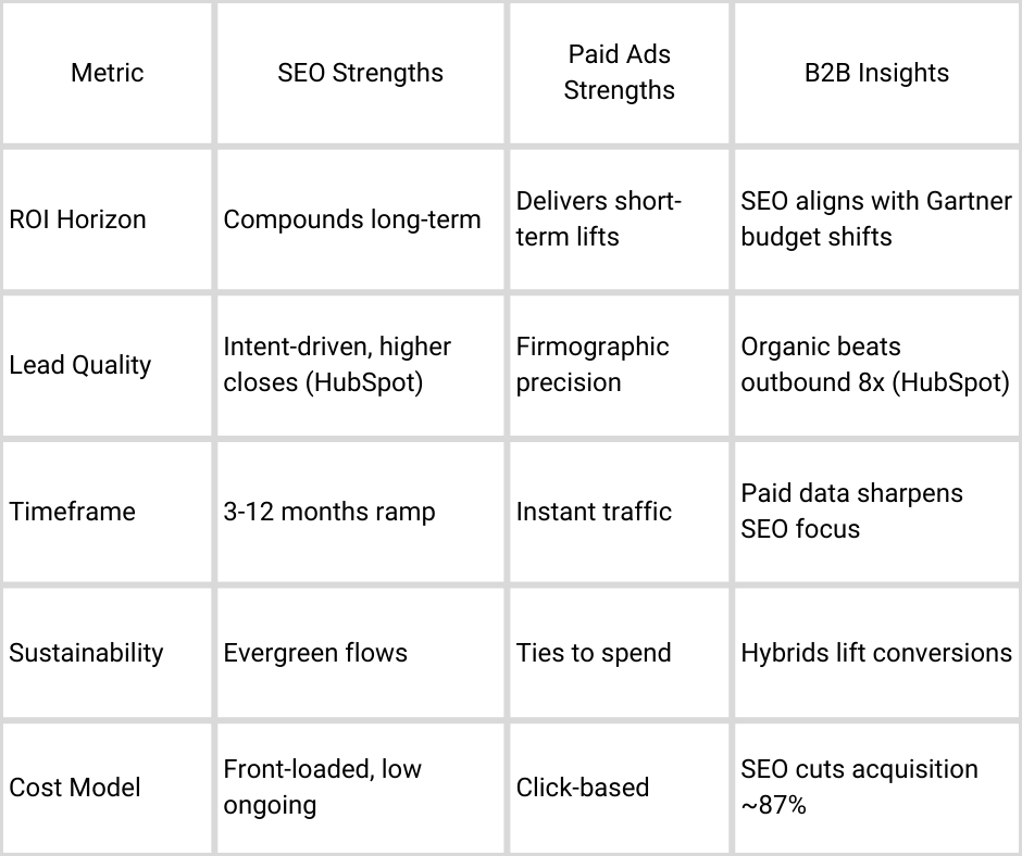 Blended approaches excel: firms using paid ads to test ideas then fueling SEO content saw 3.8x returns, accelerating pipeline velocity.